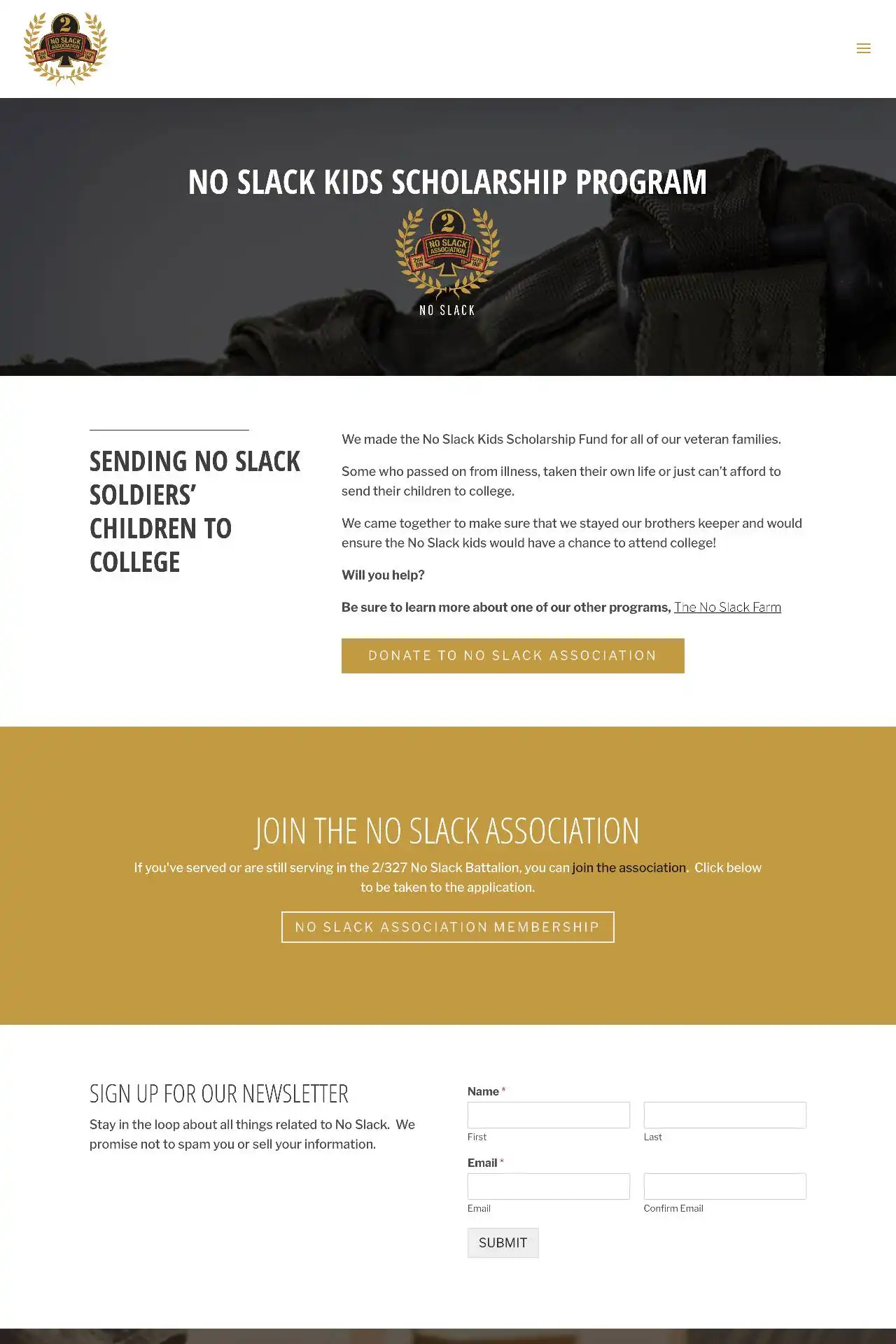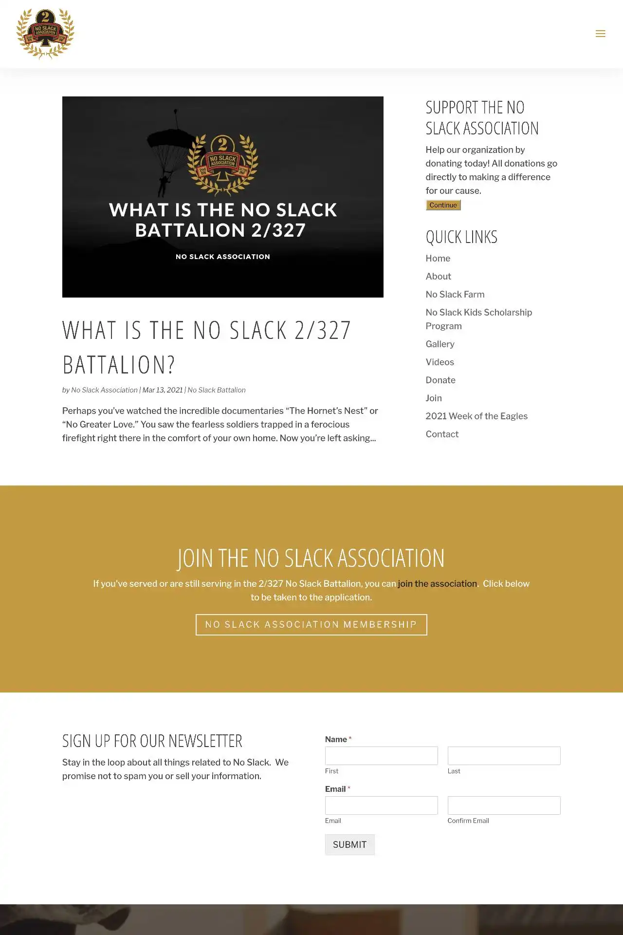 The No Slack Association’s mission statement is to “Provide support, encouragement, and brotherhood to the Veterans, Soldiers, and Families of 2/327th.”