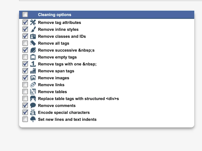 Many CMS platforms use WYSIWYG editors (like WordPress), which can leave behind unnecessary code, such as extra <div> tags, inline styles, and redundant formatting. HTML Cleaner simplifies cleaning up this “dirty” code, making it easy to convert it into something more manageable and professional. It’s the perfect solution for keeping the ease of a WYSIWYG editor but still needing clean, efficient HTML output.
