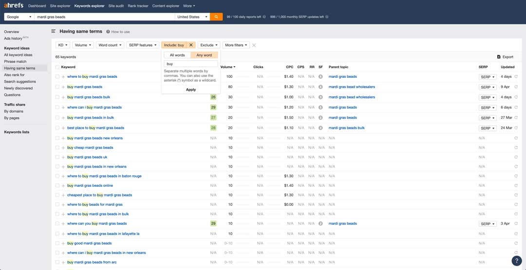 If youāre using a keyword research tool like Ahrefs, you can use these modifiers to filter for keywords with specific intent when doing keyword research.